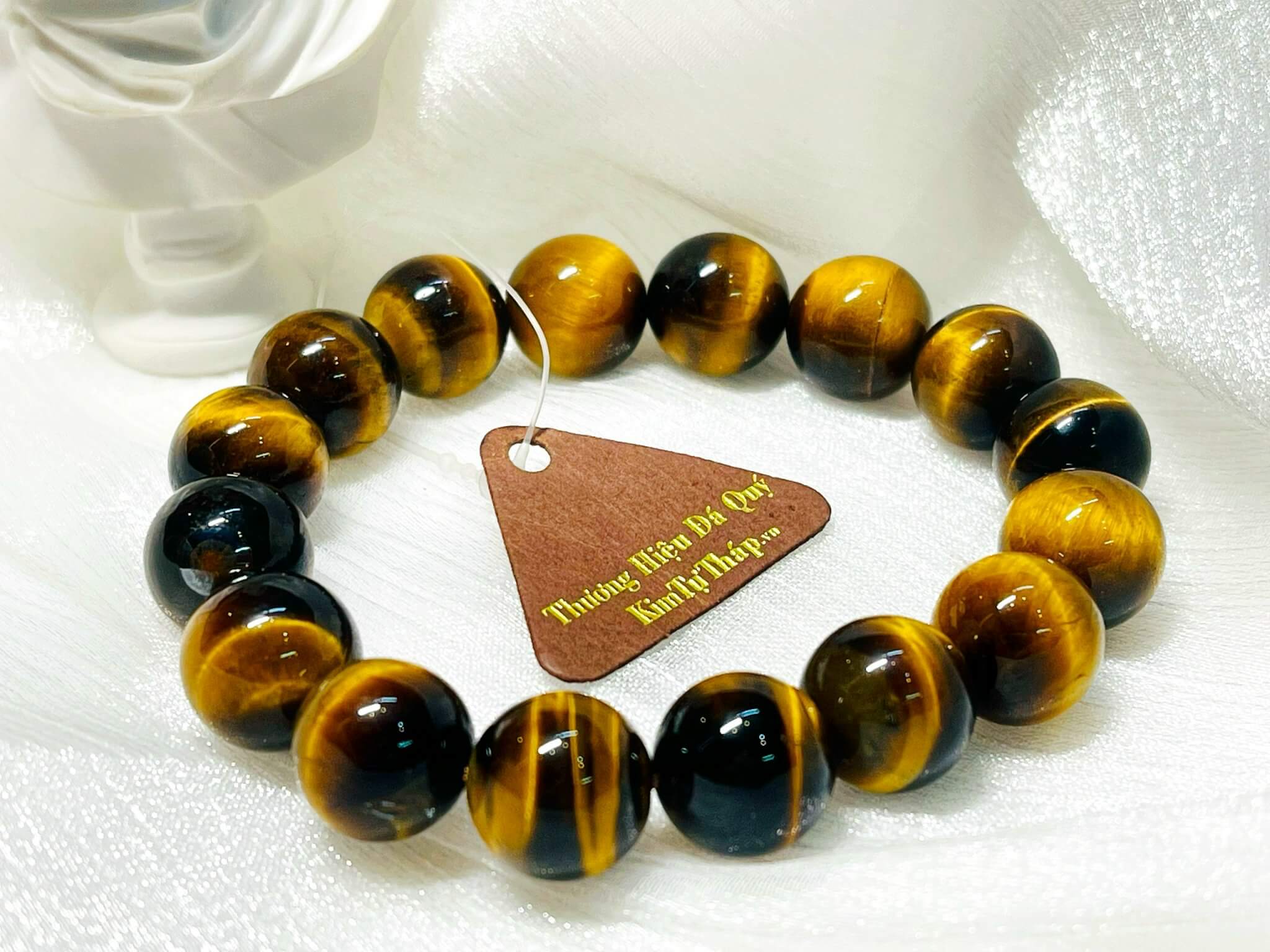 - Vòng tay đá mắt hổ: Đây là lựa chọn phổ biến và hiệu quả nhất cho năng lượng cá nhân. Việc đeo vòng tay giúp năng lượng của đá tiếp xúc trực tiếp với da, liên tục tương tác với hào quang của bạn. Nó như một người trợ lý năng lượng luôn ở bên cạnh, duy trì sự tự tin và tập trung suốt cả ngày. Gợi ý mẫu vòng tay tốt nhất cho doanh nhân: Chúng tôi đề xuất mẫu vòng tay đá mắt hổ vàng nâu, hạt kích thước 12mm – 14mm, thiết kế tối giản nhưng mạnh mẽ. Kích thước này vừa đủ để tạo cảm giác vững chãi, quyền lực trên cổ tay mà không quá phô trương, phù hợp với môi trường công sở và các cuộc gặp gỡ đối tác.