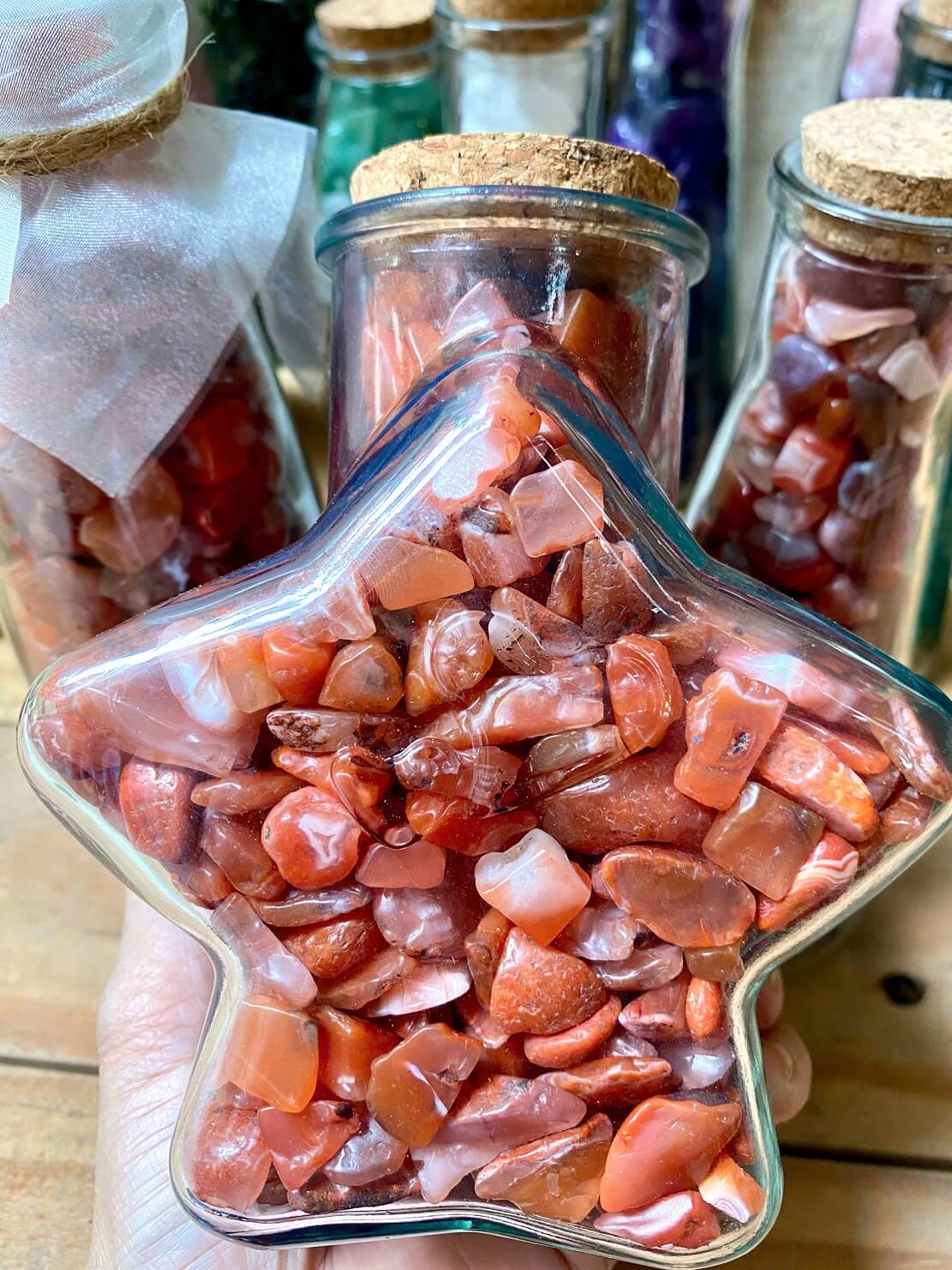 Chai đá mã não đỏ là sản phẩm trang trí để bàn nhỏ gọn, được làm từ mã não đỏ tự nhiên với sắc đỏ nổi bật, tạo cảm giác ấm áp và thu hút. Đá vụn sạch, đựng trong chai thủy tinh trong suốt, thích hợp trưng bày tại bàn làm việc, kệ sách hoặc làm quà tặng ý nghĩa.