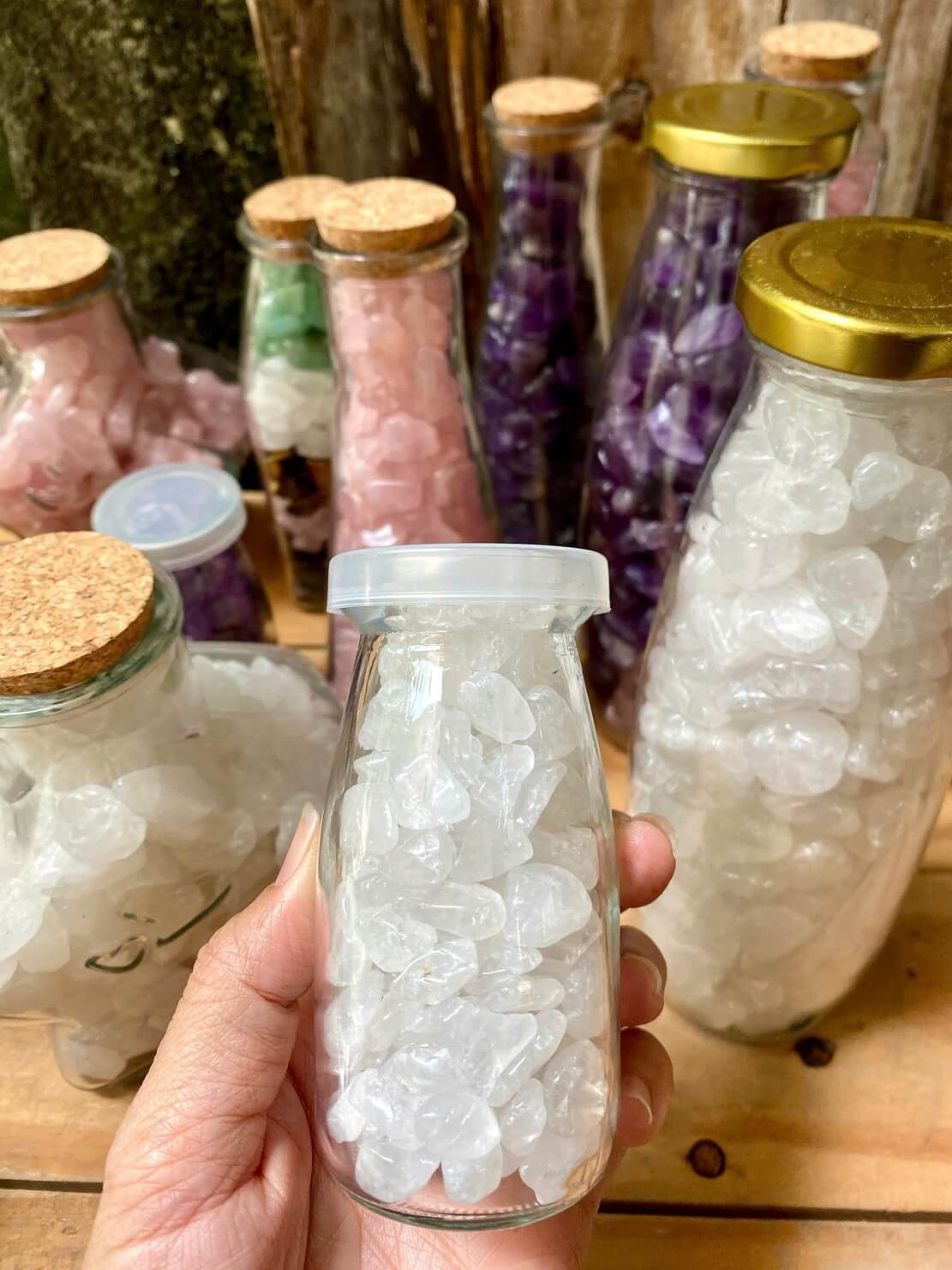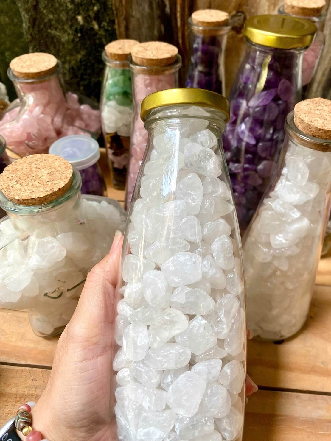 Chai đá thạch anh vụn trắng trong là sản phẩm trang trí nhỏ gọn, được làm từ thạch anh trắng tự nhiên có độ trong cao. Đá vụn sạch, sáng, đựng trong chai thủy tinh trong suốt, tạo cảm giác tinh tế và hiện đại, phù hợp nhiều không gian sử dụng.